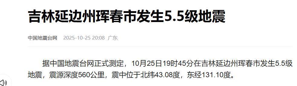 吉林省珲春市发生5.5级地震,震源深度560公里。震中附近的村民表示,他们感觉不到。当地历史上曾发生过多次较大震级的地震,但都没有造成灾难。